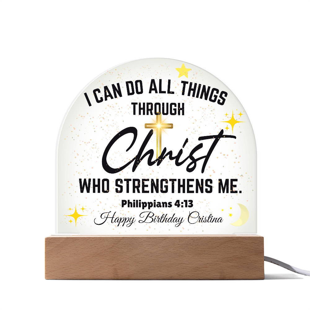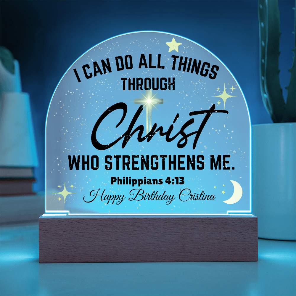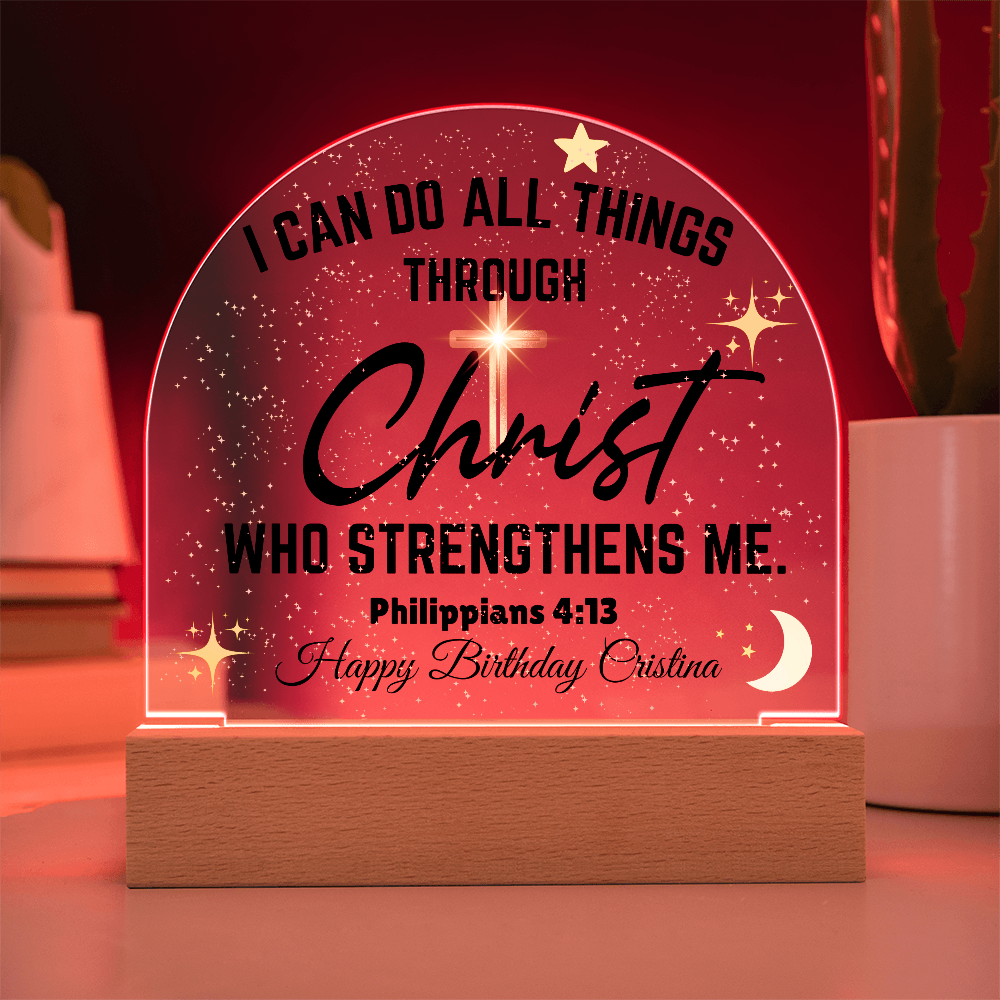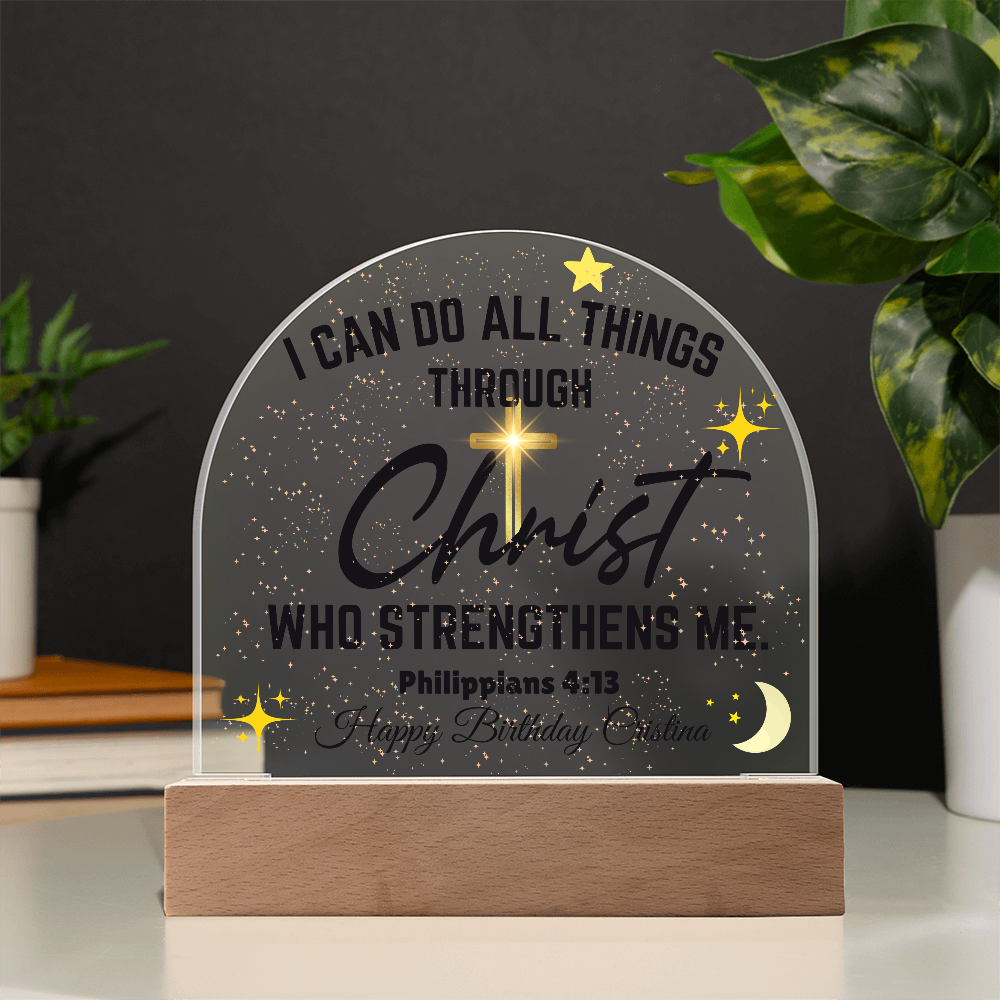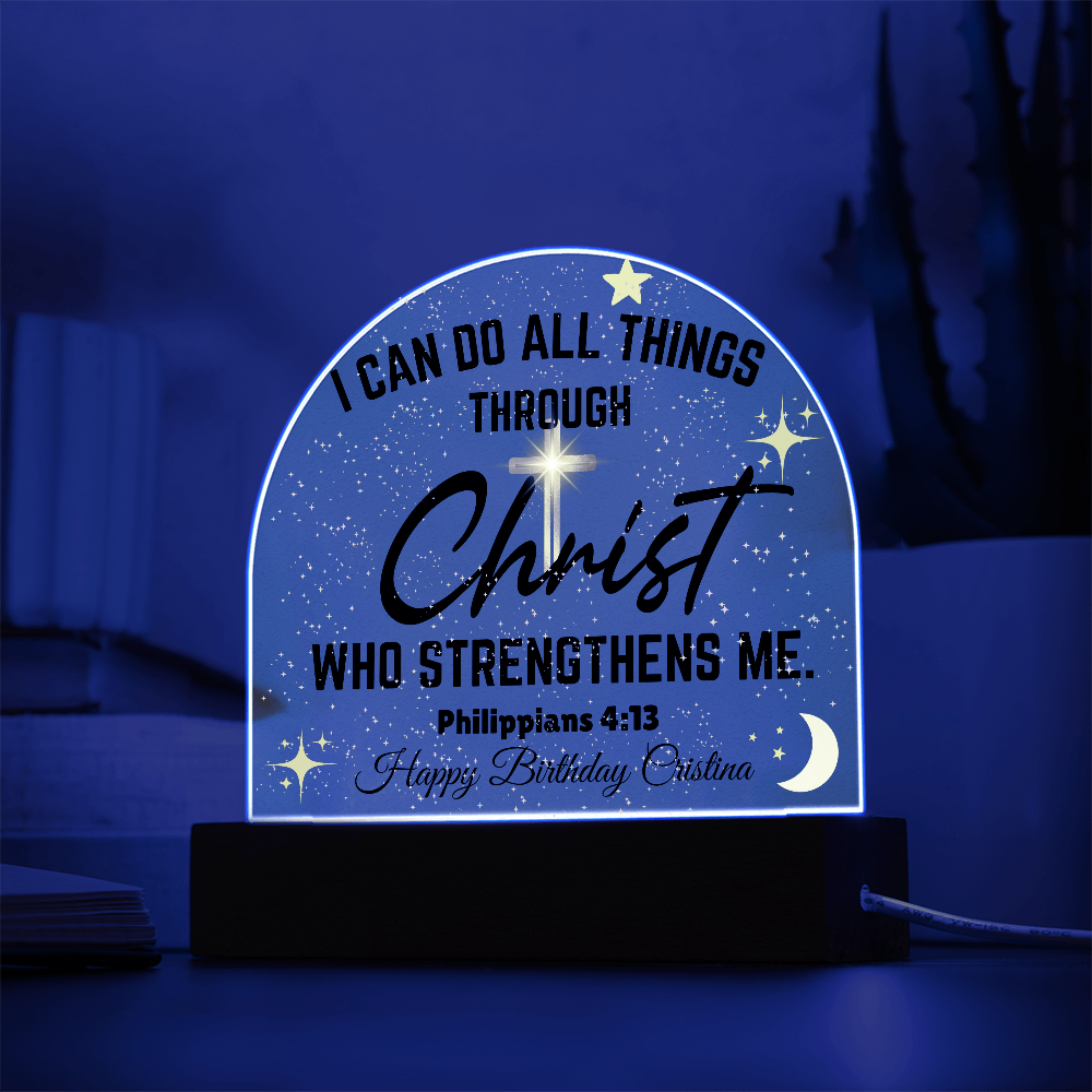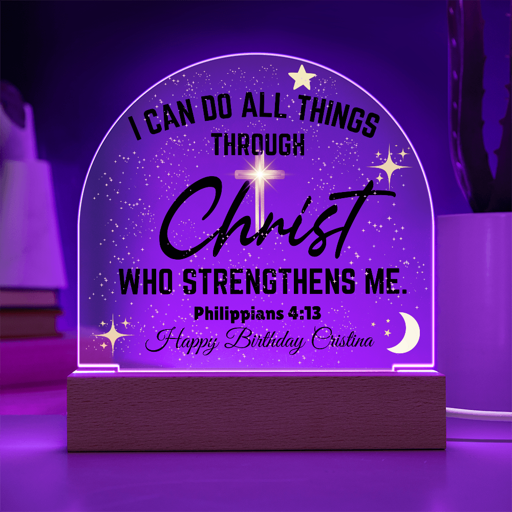 Your plaque will be crafted from premium acrylic with a professionally printed design for a polished look. It comes with a stylish wooden LED base, and you can choose between a USB plug-in option OR a cordless battery-operated option (requires 2 AAA batteries, not included). Both LED bases feature 7 vibrant colors, allowing the user to customize the lighting with various color changes and dynamic cycles.